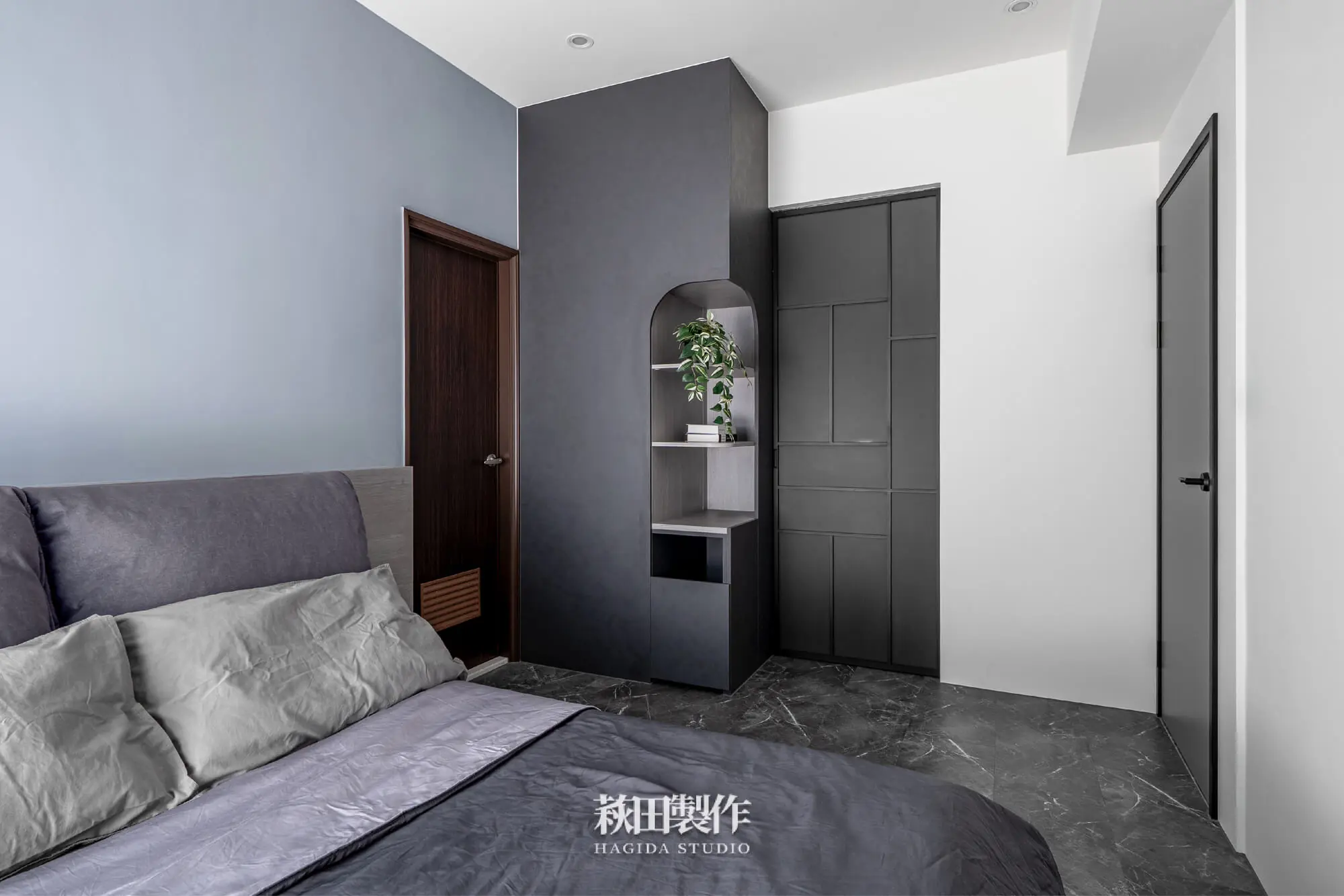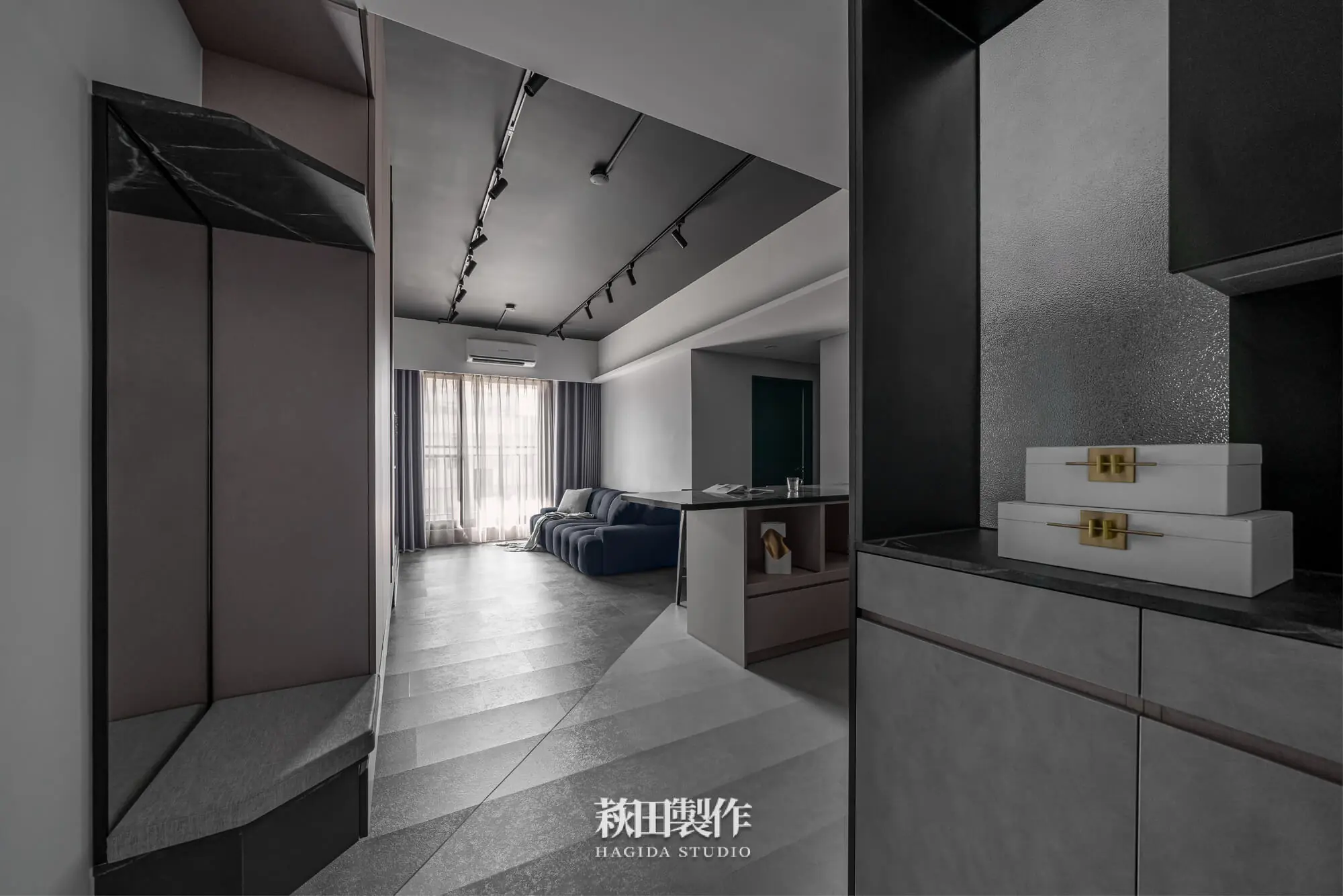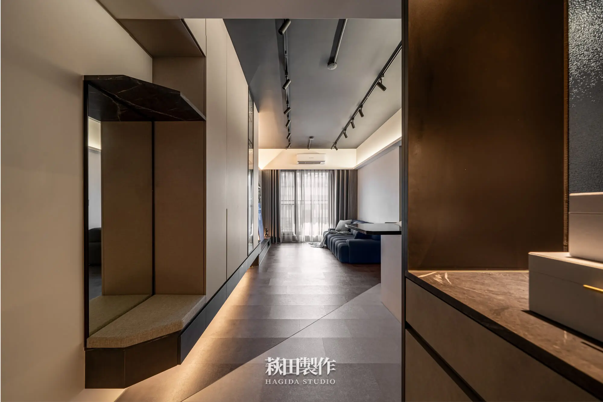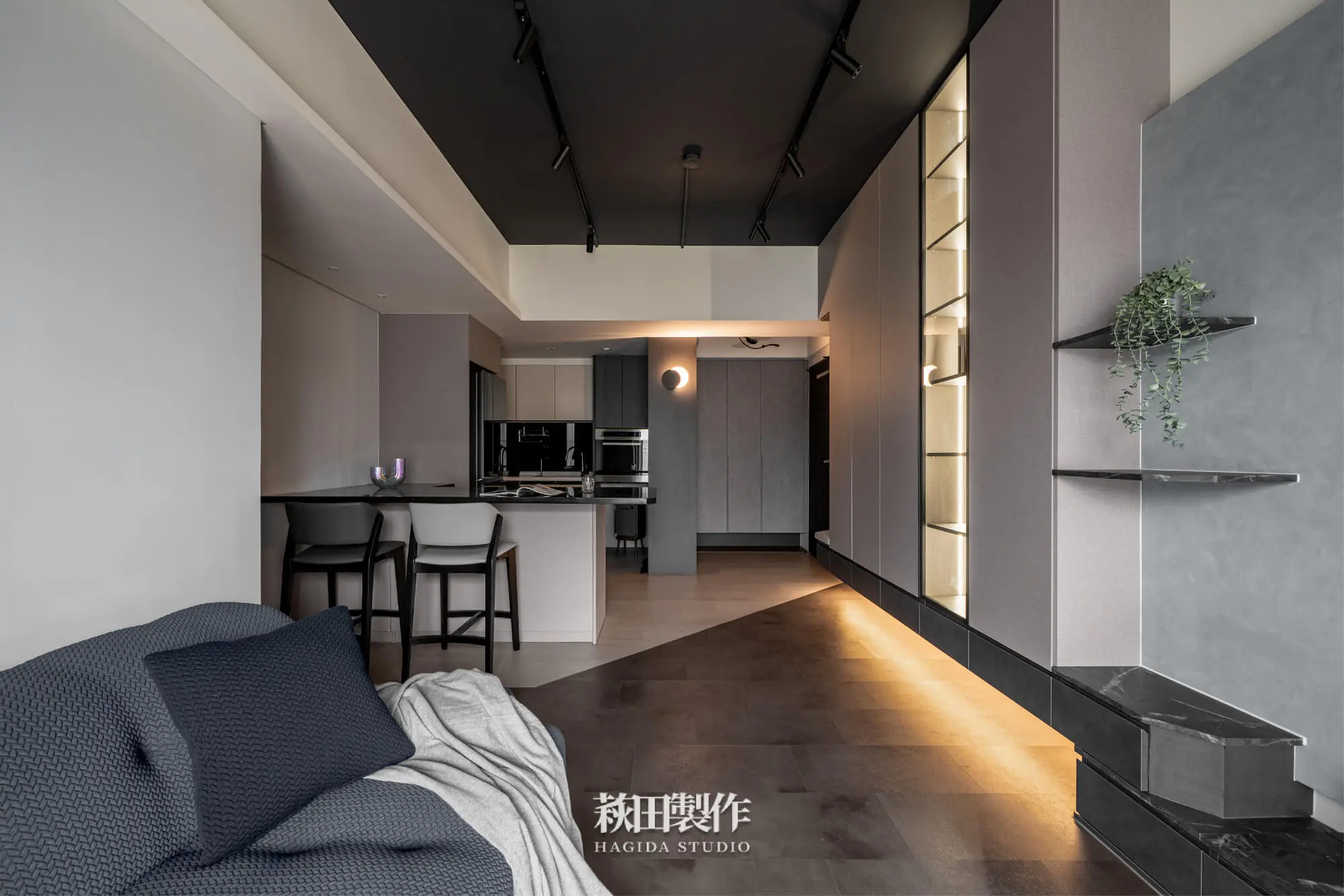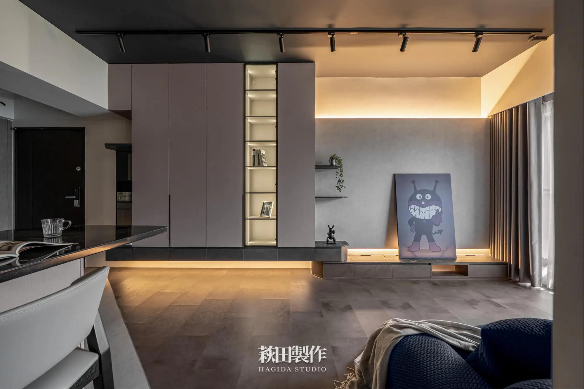 主要建材:系統板、木作、馬來漆、跳色乳膠漆、人造石、銀霞玻璃、灰玻璃、噴砂玻璃、超耐磨SPC地板、黑色鋁框、遮光捲簾、風琴簾、緞面蛇簾、紗簾、鋁條燈、軌道投射燈