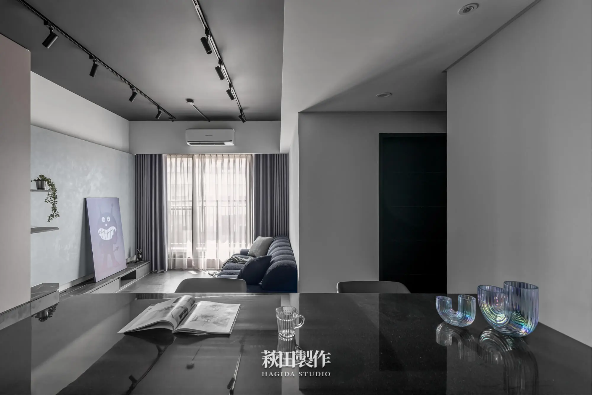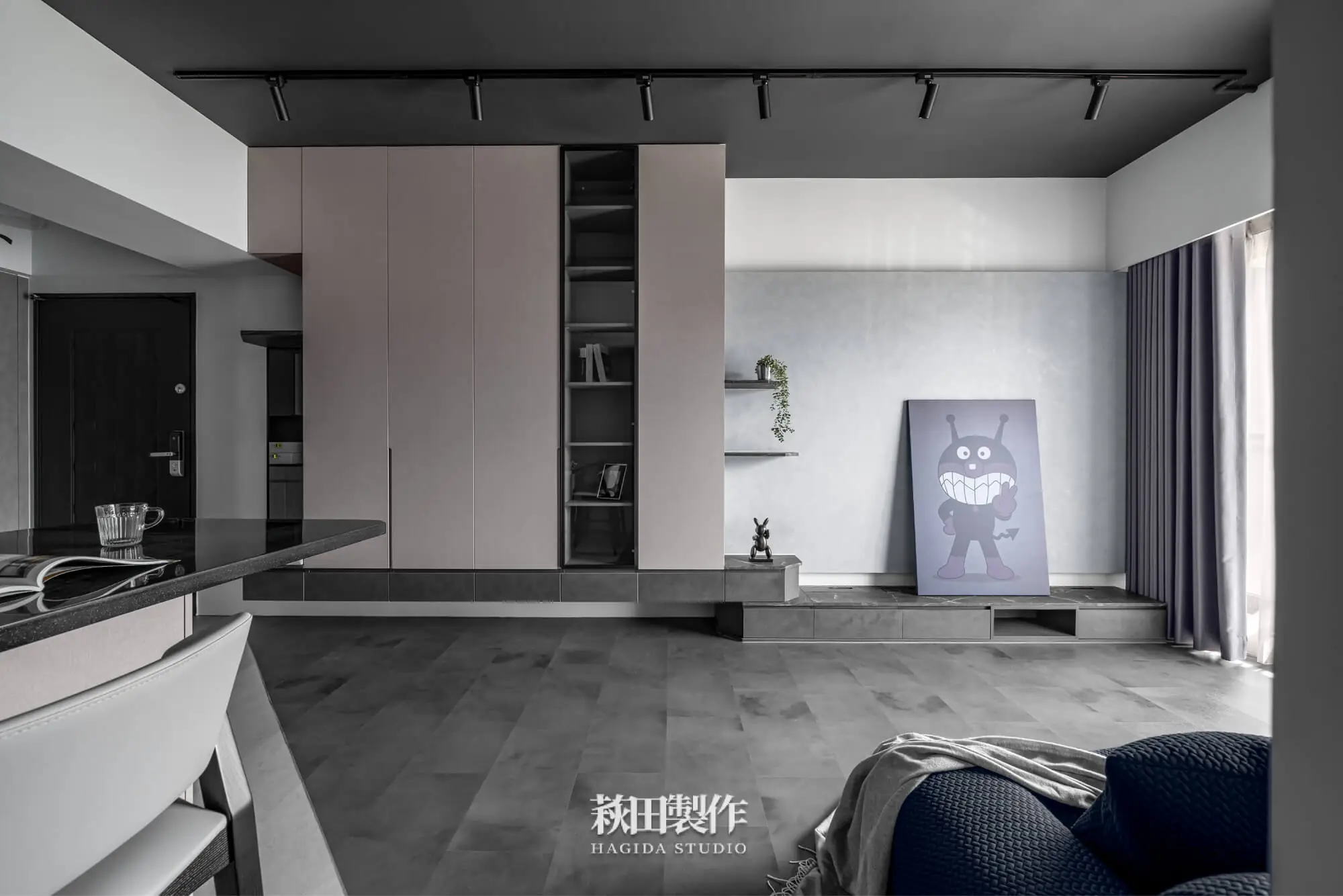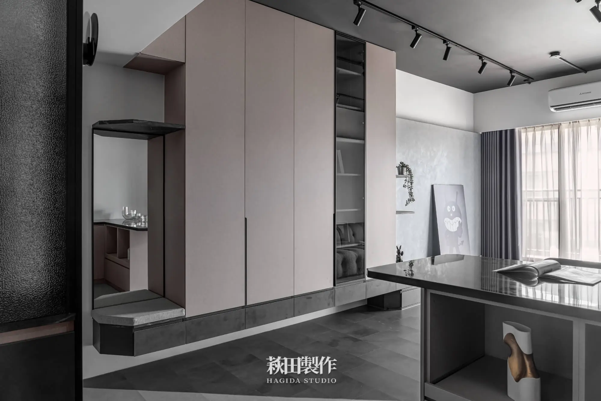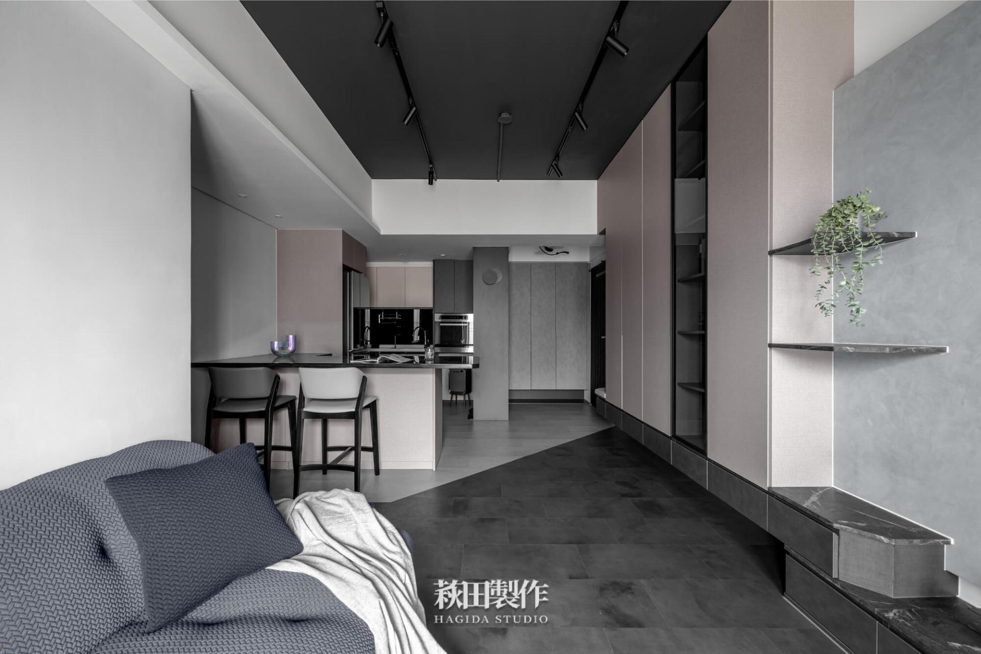 主要建材:系統板、木作、馬來漆、跳色乳膠漆、人造石、銀霞玻璃、灰玻璃、噴砂玻璃、超耐磨SPC地板、黑色鋁框、遮光捲簾、風琴簾、緞面蛇簾、紗簾、鋁條燈、軌道投射燈