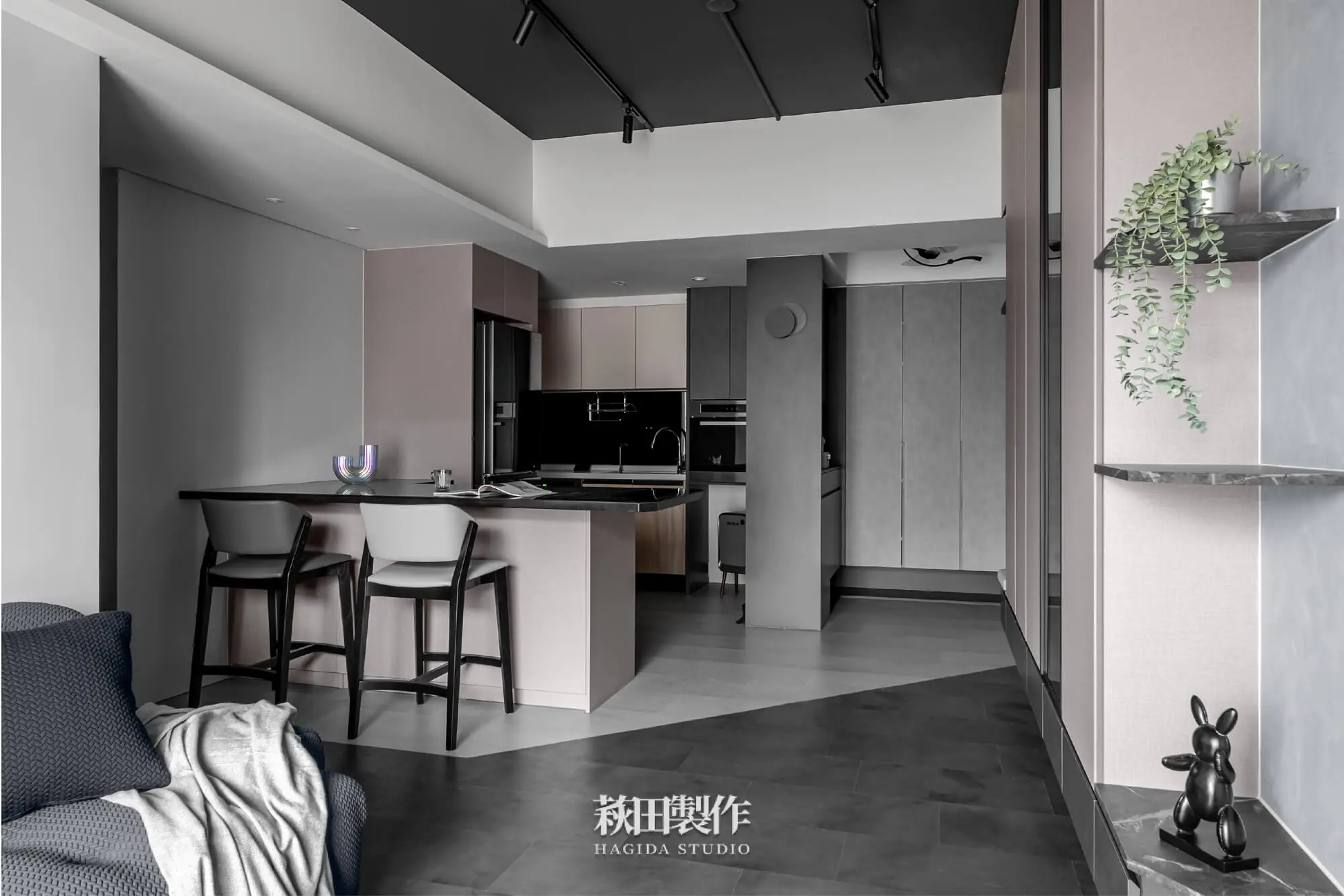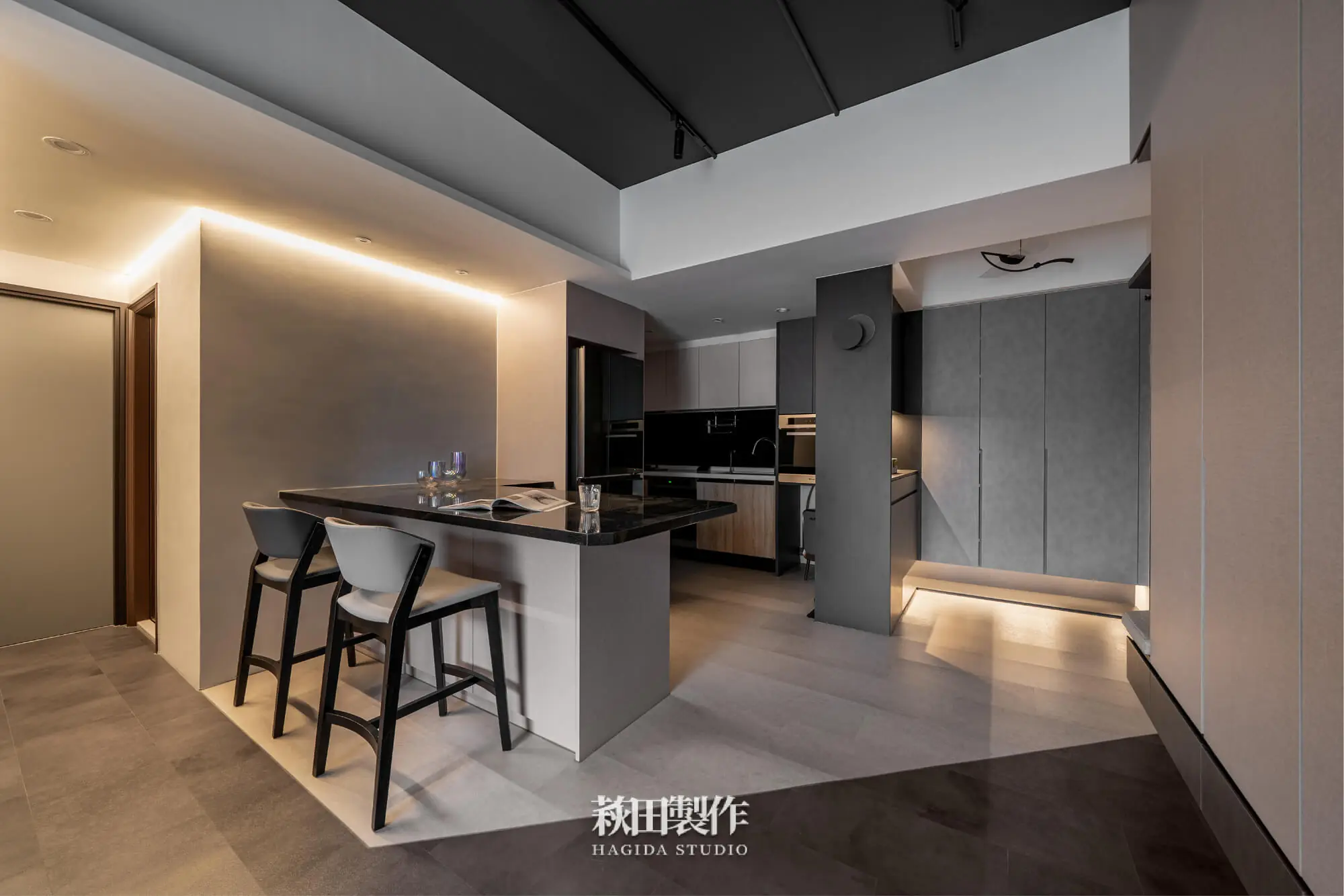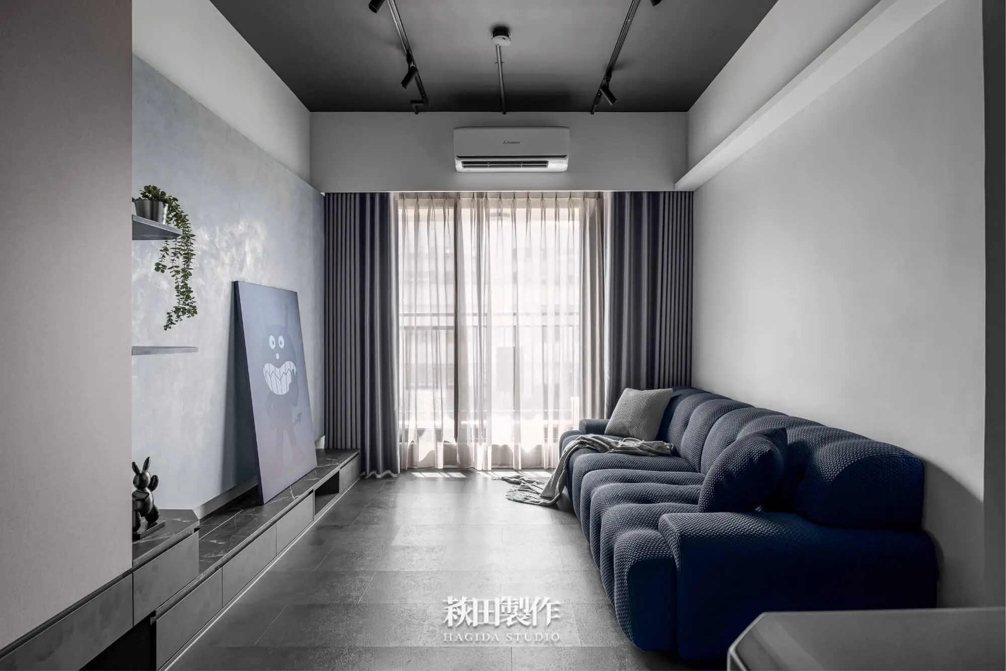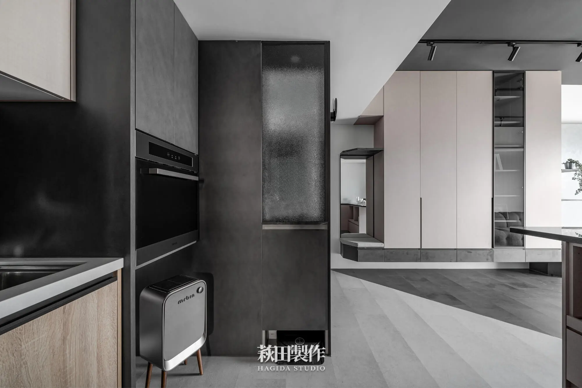 主要建材:系統板、木作、馬來漆、跳色乳膠漆、人造石、銀霞玻璃、灰玻璃、噴砂玻璃、超耐磨SPC地板、黑色鋁框、遮光捲簾、風琴簾、緞面蛇簾、紗簾、鋁條燈、軌道投射燈